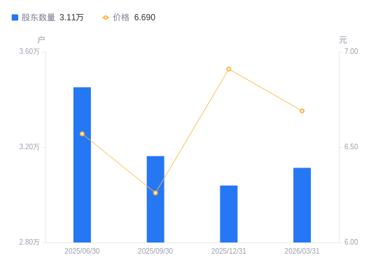 4月12日消息,数据显示,截至2026年3月31日,A股股东总户数为3.11万户,较上期(2025年12月31日)增加747户,增幅2.46%。公司最新A股总股本为5.74亿股,其中流通A股5.74亿股,户均持有流通A股数量为1.84万股,较上期减少453.4股,降幅2.40%;户均持流通A股市值12.34万元,较上期减少7190.81元,降幅5.51%。