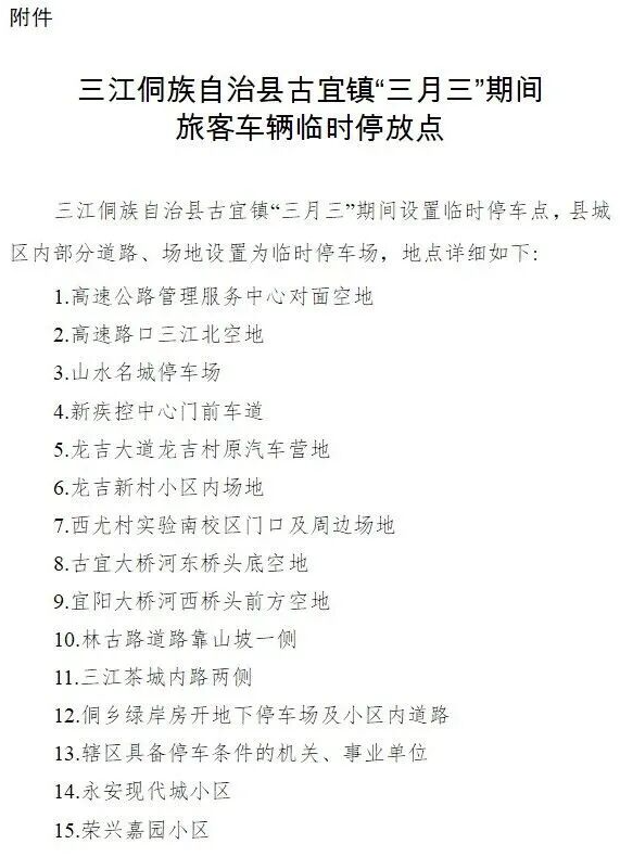 4月14日,柳州三江侗族自治县发布公告:为做好三江侗族自治县古宜镇“三月三”花炮节旅客车辆停放工作。经研究决定,“三月三”期间将古宜镇辖区内部分路段和场地设置为临时停车场。
