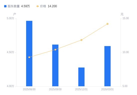 4月14日消息,数据显示,截至2026年3月31日,A股股东总户数为4.59万户,较上期(2025年12月31日)增加3160户,增幅7.39%。公司最新A股总股本为12.08亿股,其中流通A股8.81亿股,户均持有流通A股数量为1.92万股,较上期减少1417.7股,降幅6.88%;户均持流通A股市值27.25万元,较上期增加2.89万元,增幅11.87%。