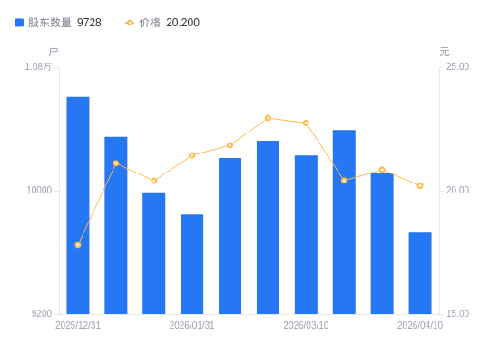 4月14日消息,数据显示,截至2026年3月31日,A股股东总户数为1.01万户,较上期(2026年3月20日)减少276户,降幅2.66%。公司最新A股总股本为1.15亿股,其中流通A股1.13亿股,户均持有流通A股数量为1.11万股,较上期增加295.61股,增幅2.73%;户均持流通A股市值23.2万元,较上期增加1.09万元,增幅4.94%。